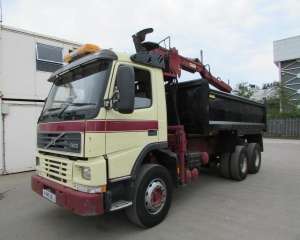 | 2001, Volvo FM12 340 6x4 Steel body tipper with grab. 26 Tonnes, Double drive on springs, 8 Speed manual gearbox, HMF extending crane with clamshell bucket, Thompson steel body, On board weigher. Clock reads:Mileage: 189, 657Km.